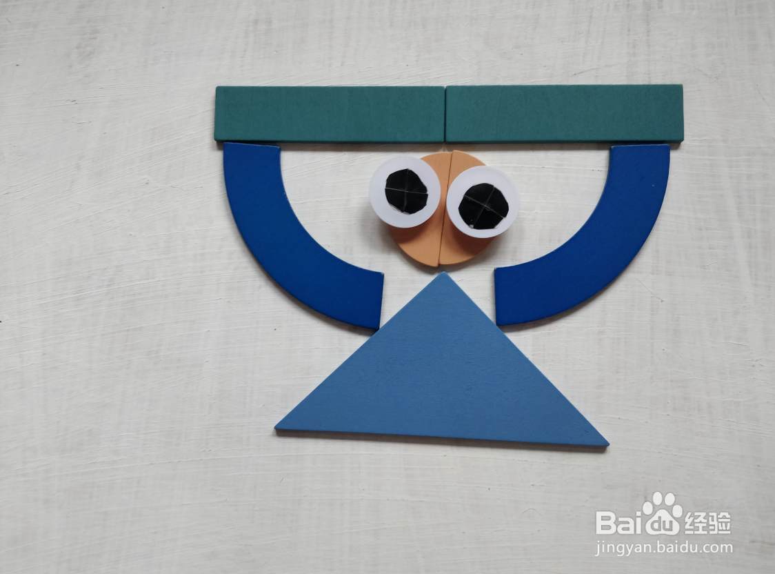 4、在三角形的上面,放上两个上下挨着的小半圆,上面放上两个眼睛,如图。