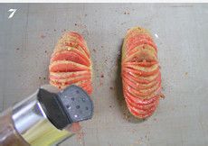 5、土豆拿出来放凉一些,小心的拨开切口把火腿一片片的放进去,如图。