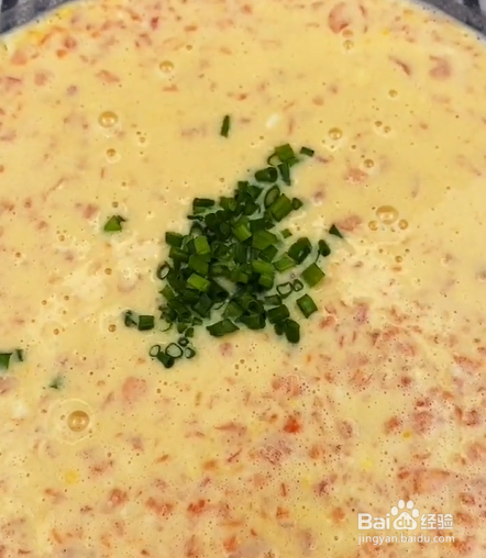3、加入面粉、加入盐,搅拌均匀,撒上小葱花,再搅拌一下