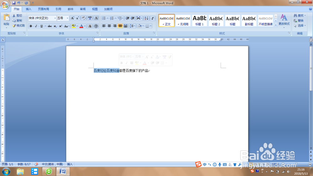 2、录入文字(用于演示),选中要双行合一的文字,如图。