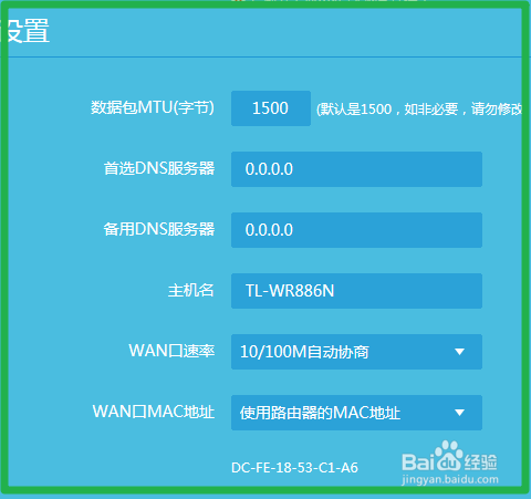 3、上网设置,查看一下路由器的WAN口MAC地址,以及在LAN口设置里面,找到另一个MAC地址,都,记录下来,这一步的目的是因为一些企业在总路由设置了行为管理,只允许指定的MAC地址的设备上网,如果不开放路由器的网络权限,无线路由器886N是无法上网的。