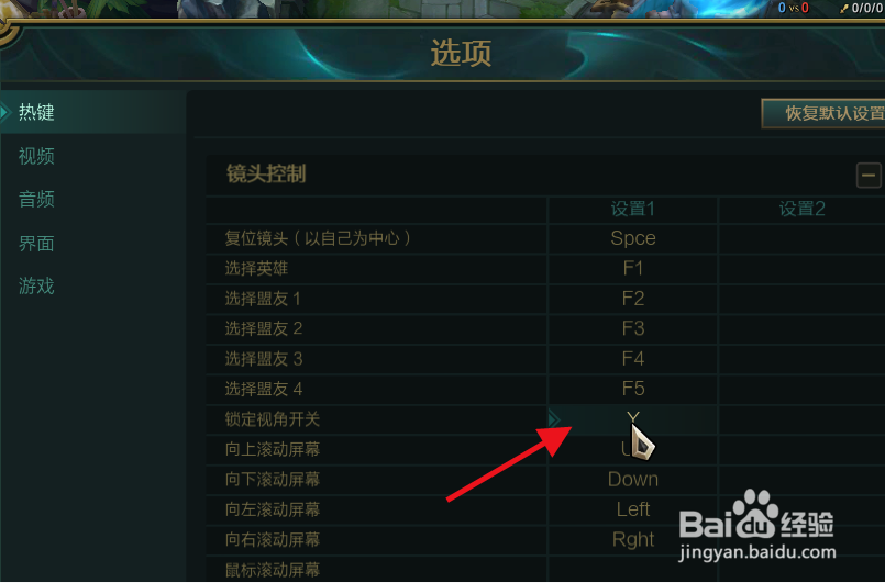 6、在热键中的镜头控制将锁定视角设为“Y”键即可。