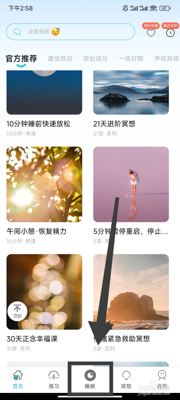 1、第一步,首先打开Now冥想软件,再点击下方的睡眠