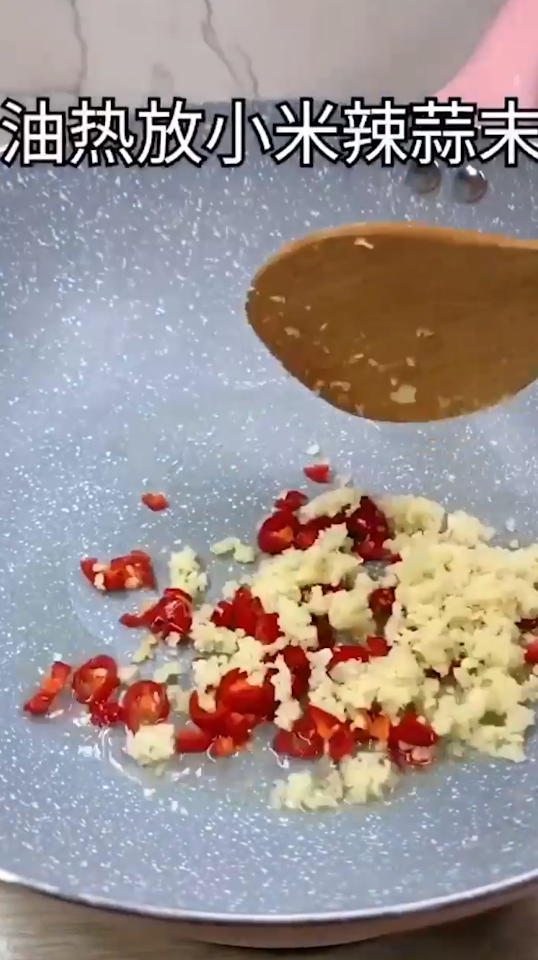 8、油热,放入小米辣、蒜末。
