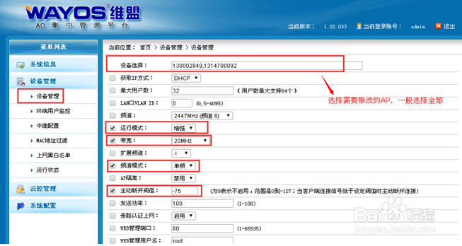 3、对AP的运行模式,频道带宽,频道模式,断开阀值等进行的批量修改方式。