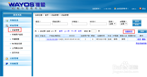2、进入AP集中管理平台,在AC集中管理平台中可以对AP进行集中管理及批量修改等。批量修改如下图,在实际覆盖环境中。