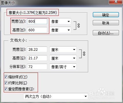 3、如果你的图片足够大的话,即缩小一些也不影响其他人浏览,那么可以先将图片尺寸减小,在菜单栏中选择图像-图像大小,或是快捷键Ctrl+Alt+I,输入新的宽度,注意下面约束比例要勾上,图片才不会变形,而且输入宽度后,会自动帮你填入高度,点击确定即可,看一下图片是否影响浏览,如果太小看不清,建议不要做这一步