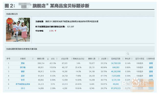 如图1~2所示为“**旗舰店”7月第二周亲子装系列投放的直通车情况。词条选取依据来自于同款服装高成交的店铺,不同的是“喜**旗舰店”将词条重新排列组合,实际投放关键词32个,但转化率非常低。通过对其中一款宝贝进行标题诊断,我们可以发现转化率较高的几个词条组合,该产品都没有命中。因此单从宝贝标题出发,数据就能给予卖家大量参考。而当涉及整体店铺定位时,就更应该依靠数据来决策。