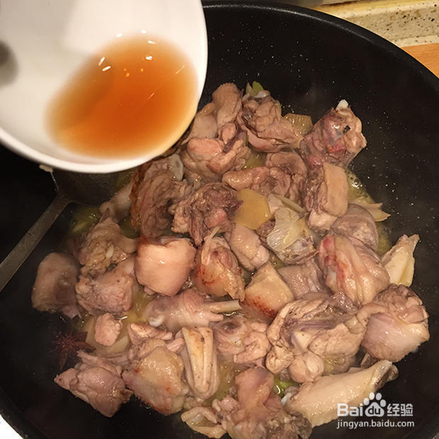 4、热油,加入洋葱,生姜,大蒜,八角,最好是大豆油。