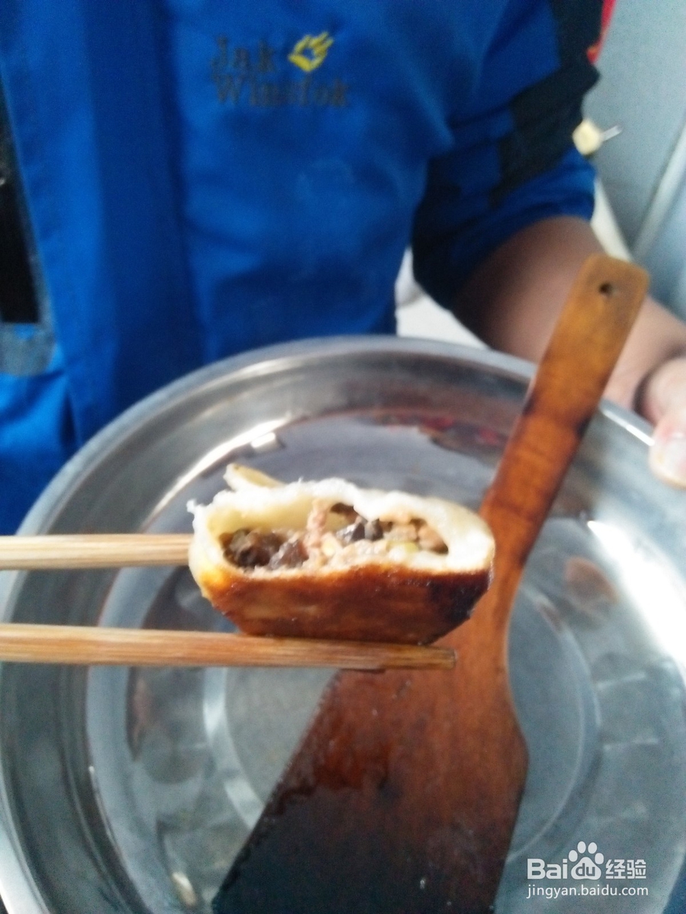 7、转动锅让锅均匀的受热,我们把包子翻过来。