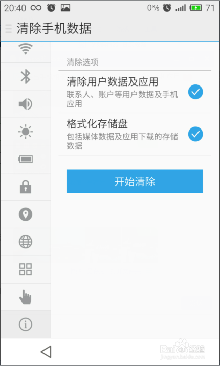 6、根据个人情况选择你要清除的数据,若你想保留用户数据以及应用,可以不用清除,就不要选择就好了,那就选择下一个,,格式化存储盘,,我选择的是两个哦,然后,点击开始清除(蓝色字样)