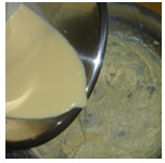 1、鸡蛋打散,依次加入淡奶油、牛奶、香草精,每加入一种都快速打发起泡,混合均匀