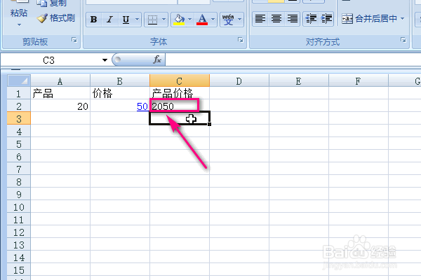 7、最后按下回车键,结果显示2050,即A2单元格数字和B2单元格数字的连接。