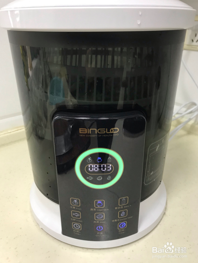 1、将宾果智能食材净化器接通电源,并将从市场上买回来的食材先用水冲洗一遍,便放入宾果食材净化器中。