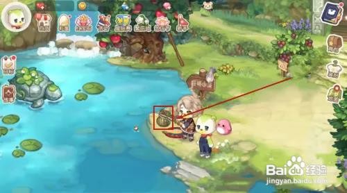 2、然后来到青水森林的叮咚小溪边,点击鱼篓拿起鱼竿。