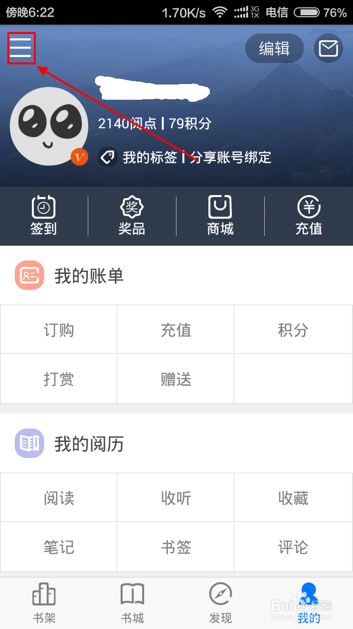 3、登录之后,点击页面左上方的三道横线按钮或者直接向左滑动屏幕,弹出菜单。