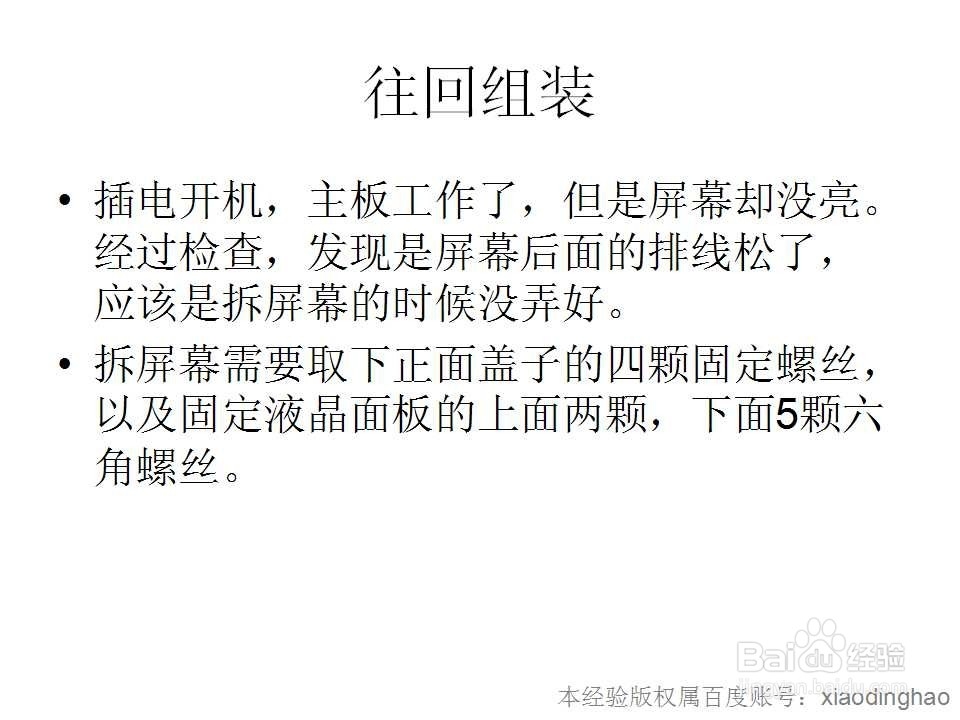 拆屏幕注意:卸下下面四颗螺丝之后,上面的壳子就可以掰开了,然后需要取下固定面板的六七颗螺丝,此时面板依然是粘在外壳上的,轻轻用力可撕下。