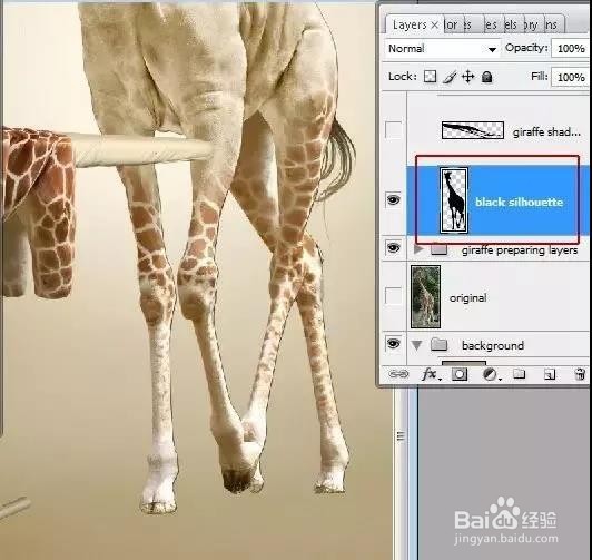 返回修饰后的长颈鹿图层,再次复制。我们将利用这个新复制的图层做一个长颈鹿的夹克。先后擦掉长颈鹿的头部和腿部。