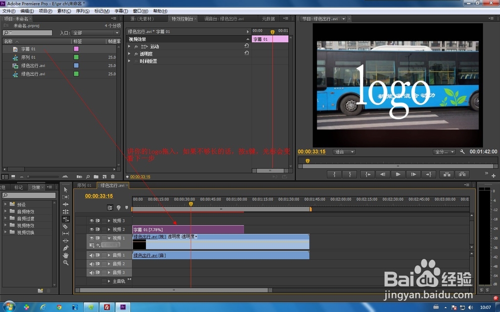 16、如果发现logo不能同步播放到最后,不用担心,点击X键,在字幕或者logo上变为可拖动时候往后拖到跟视频一样长就可以了