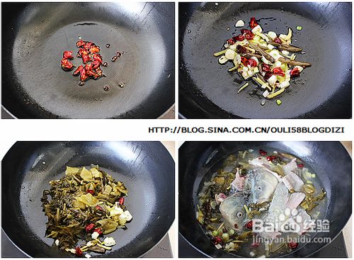 4、锅里放1勺油,开小火,凉油下锅一半的辣椒,加入葱姜、八角、花椒和野山椒煸炒,下入切丝的酸菜翻炒,将鱼头、鱼骨和鱼尾放入锅中翻炒,翻炒均匀后倒入热水,水中加入适量盐