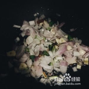 2、锅里倒油,放入洋葱、花椒、大蒜、辣椒、葱白爆香,炒至洋葱微微焦黄
