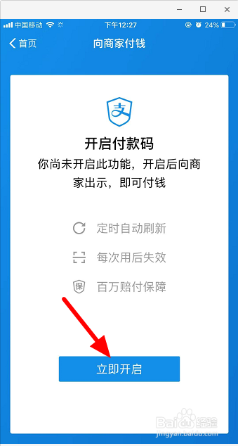 5、设置后,在进入“付钱”后,就不会显示付款码,点击“立即开启”。
