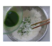 3. 将菠菜汁缓缓倒入面粉盆中搅拌,揉成光滑略硬的面团。