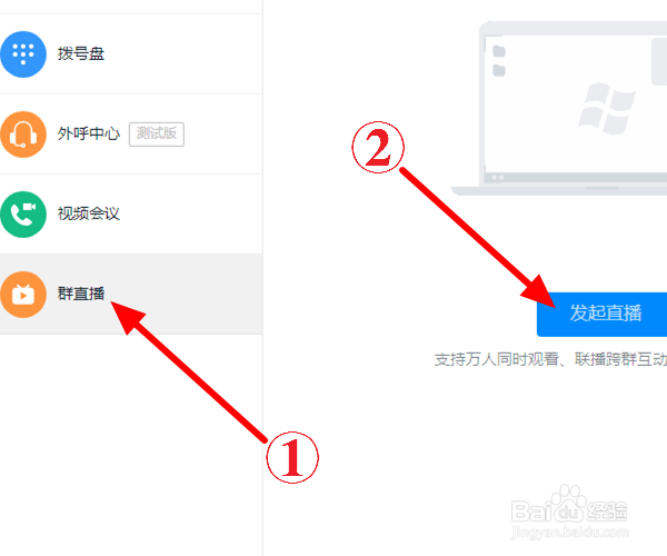 1、【1】打开钉钉,进入后,点击 电话>群直播>发起直播;