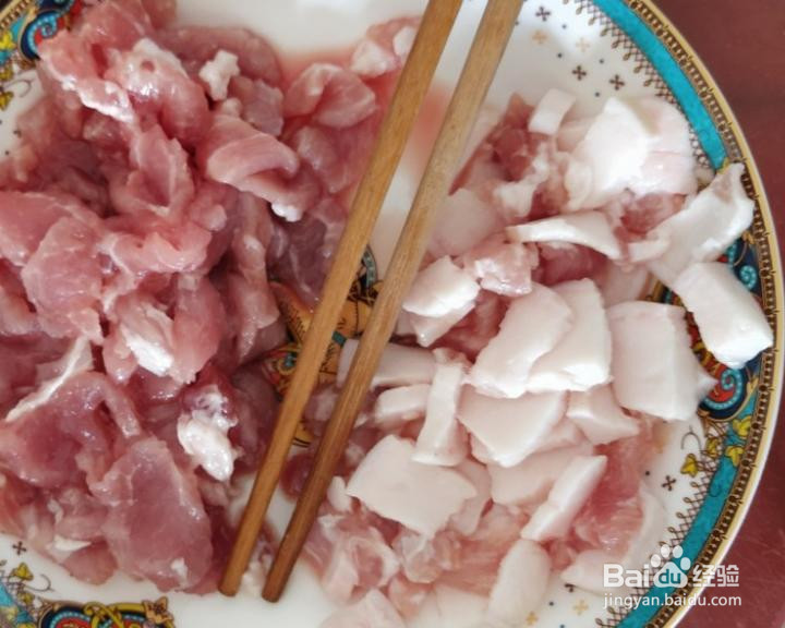 1、先把肉切成小块,分开肥肉和瘦肉(因为这块好像是腿肉),分别下一点花生油和盐腌制半小时以上,(也可以加上一点料酒腌制,但为了保存肉的原味,我只放了油盐)