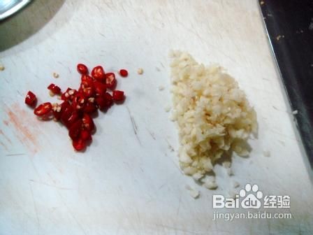 4、小米椒切成红椒圈,大蒜取三分之二切成粗末备用。