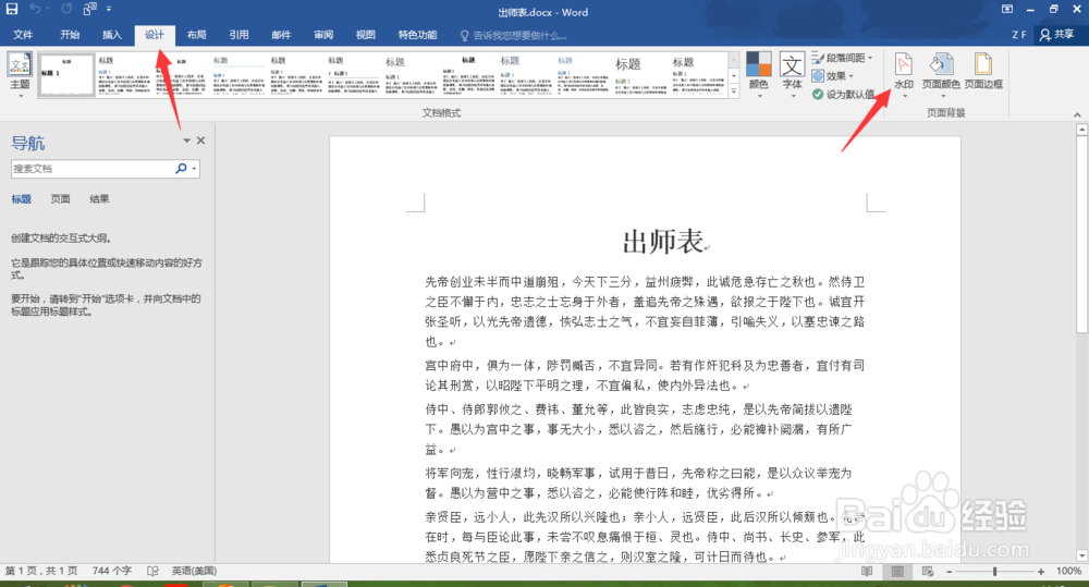首先点击工具栏上的“设计”,找到右上角的“水印”,Word 2010版是“页面布局”-“水印”,和2016有些区别,下面以2016为例进行讲解。