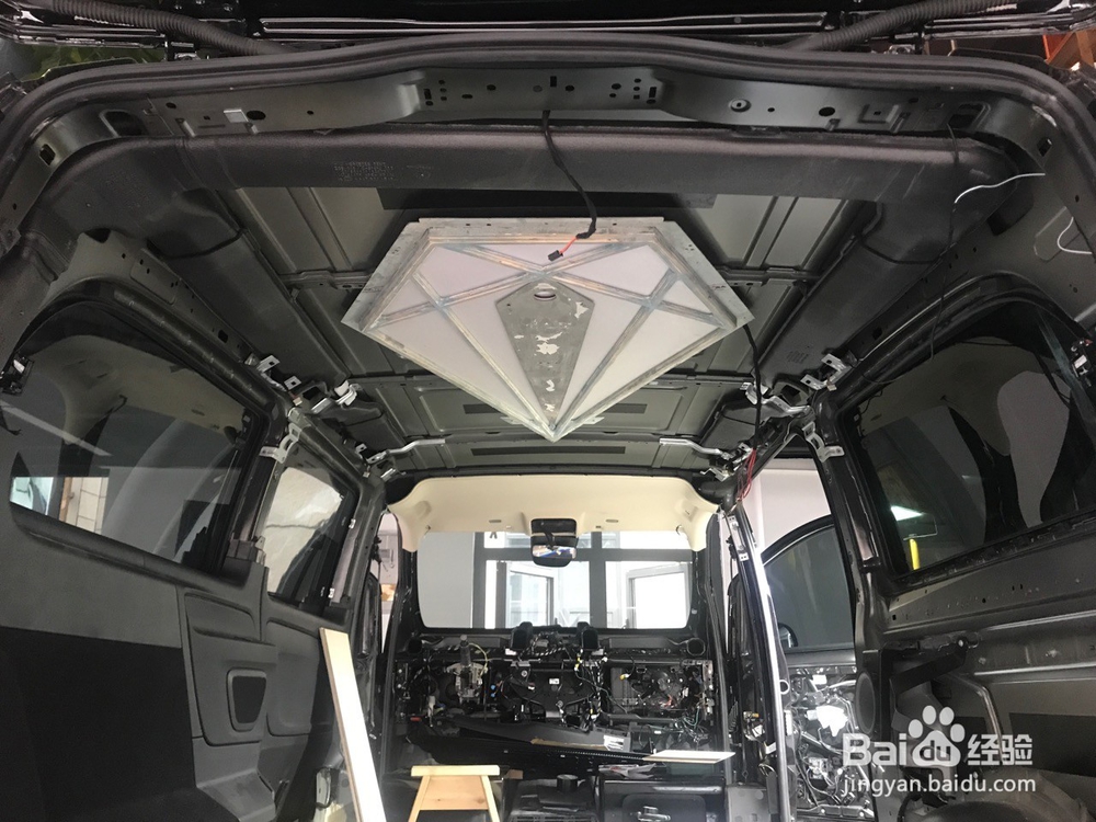 2、顶棚改装:先拆卸原车顶棚,然后制作不锈钢框架固定好钻石顶灯,利用奔驰威霆原车结构将顶棚固定车内,螺丝上紧