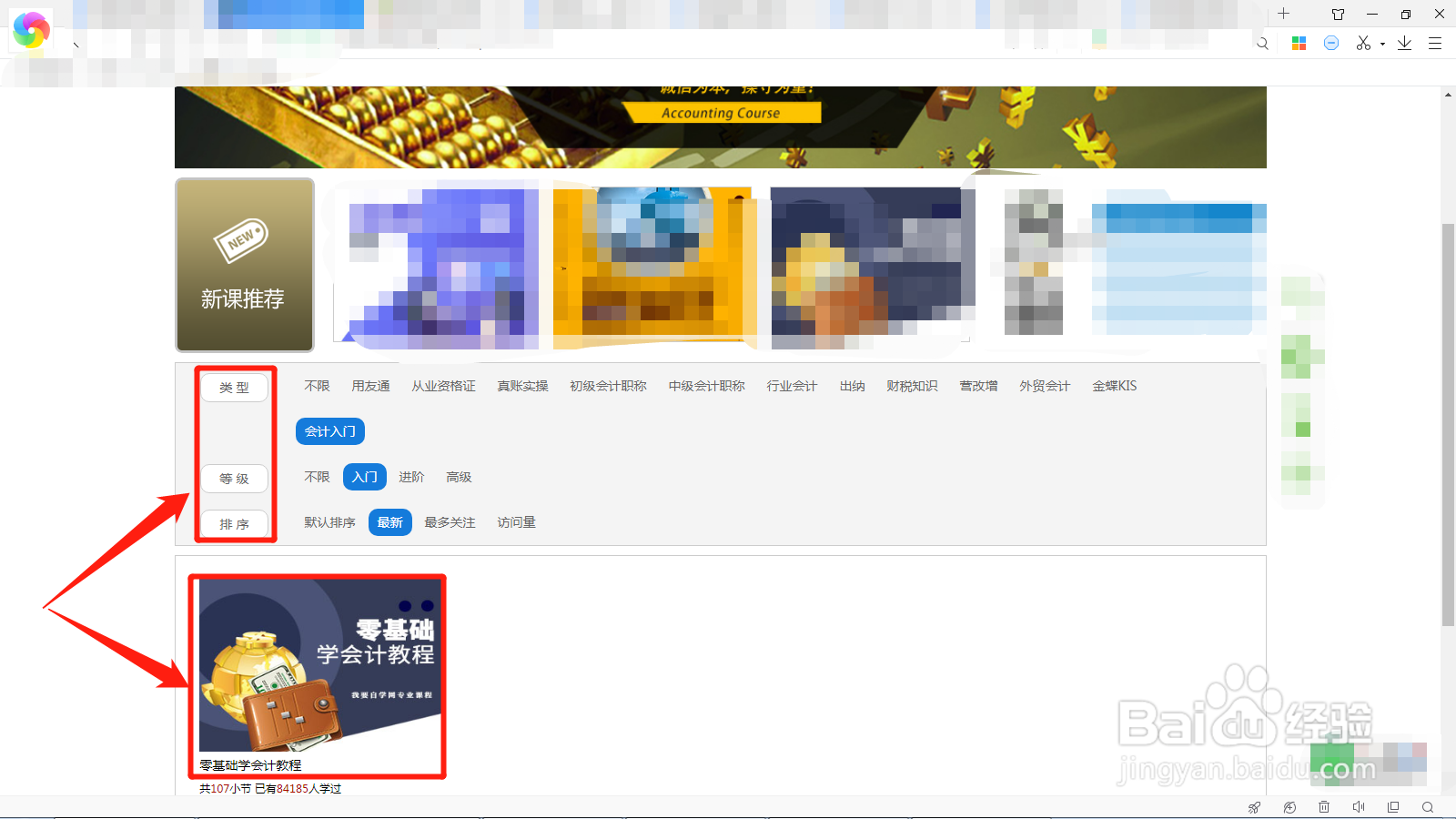 4、下拉页面,设置课程类型、等级、排序,查看【零基础学会计教程】。