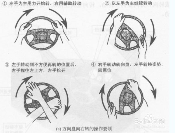 ①方向盘向右转,其操作要领如图4-32 (a)所示。