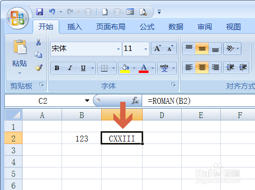 7、这样,输入函数的单元格中就自动显示相应的罗马数字了。