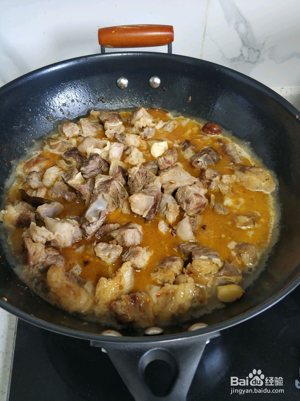4、植物油9成热,放入上述大料,炒香。放入牛肉,炒10分钟,放入昭通酱(香而不辣,黄焖红烧必备),冰糖(或糖色),料酒2勺,酱油两勺,再炒几分钟,放入热水煮沸,转入高压锅炖10分钟