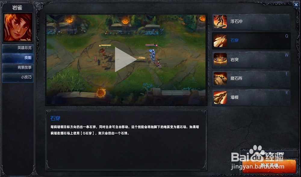 岩雀的被动是岩石冲,简单点说就是靠近墙或者建筑物可以增加岩雀的移速,这个被动技能我个人觉得没什么用,但是我们还是要好好利用一下,去线上的时候我们尽量靠近墙走,速度会快很多,去支援其他路的时候也可以靠近墙走,更快到达战场。