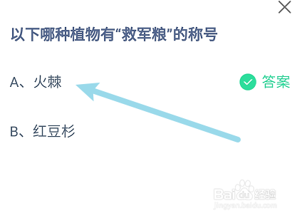 正确答案是:火棘 。(以下哪种植物有“救军粮"的称号?答案火棘。 )