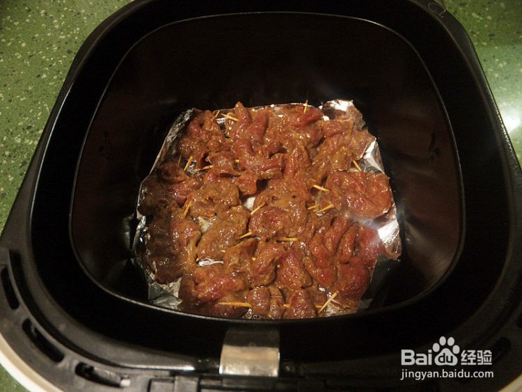 8、预热空气炸锅,200°C/5分钟,在锅里铺上锡纸,把肉串放上去
