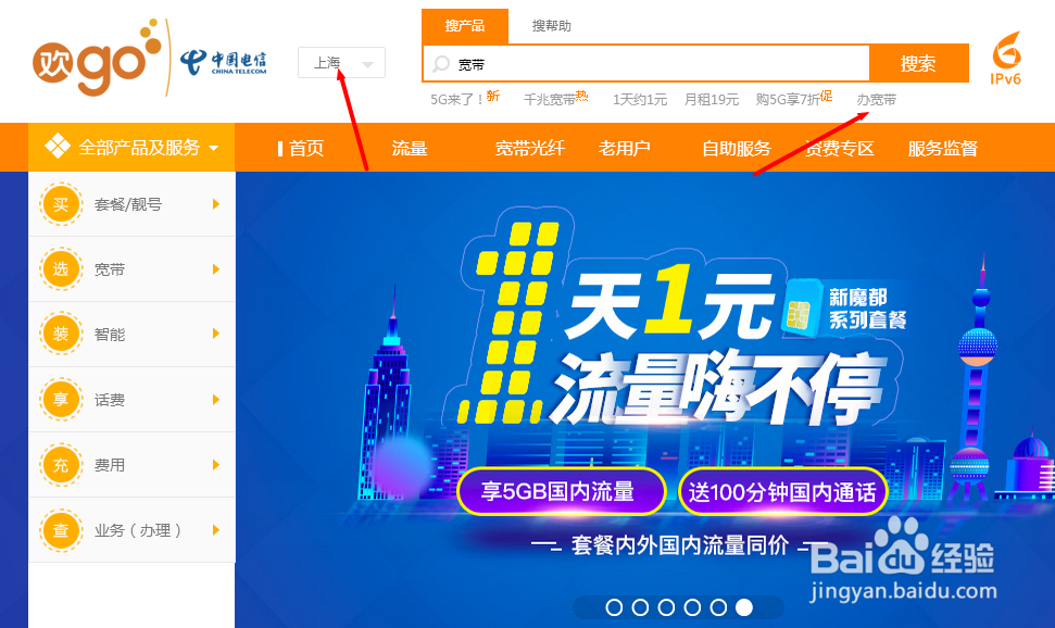 2、点击进入电信网上营业厅,先选择安装宽带的地点(城市),再点击“办宽带”。