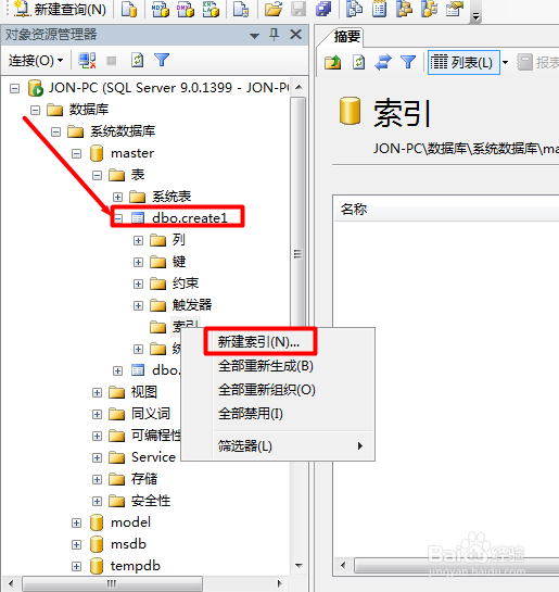 2、打开目录:数据库-->系统数据库-->master-- >表-->系统表-->dbo.student-->索引。。这里我只是拿student来举例。你可以选择其他表方法一样的。右击索引选择新建索引。弹出新建索引的窗口。