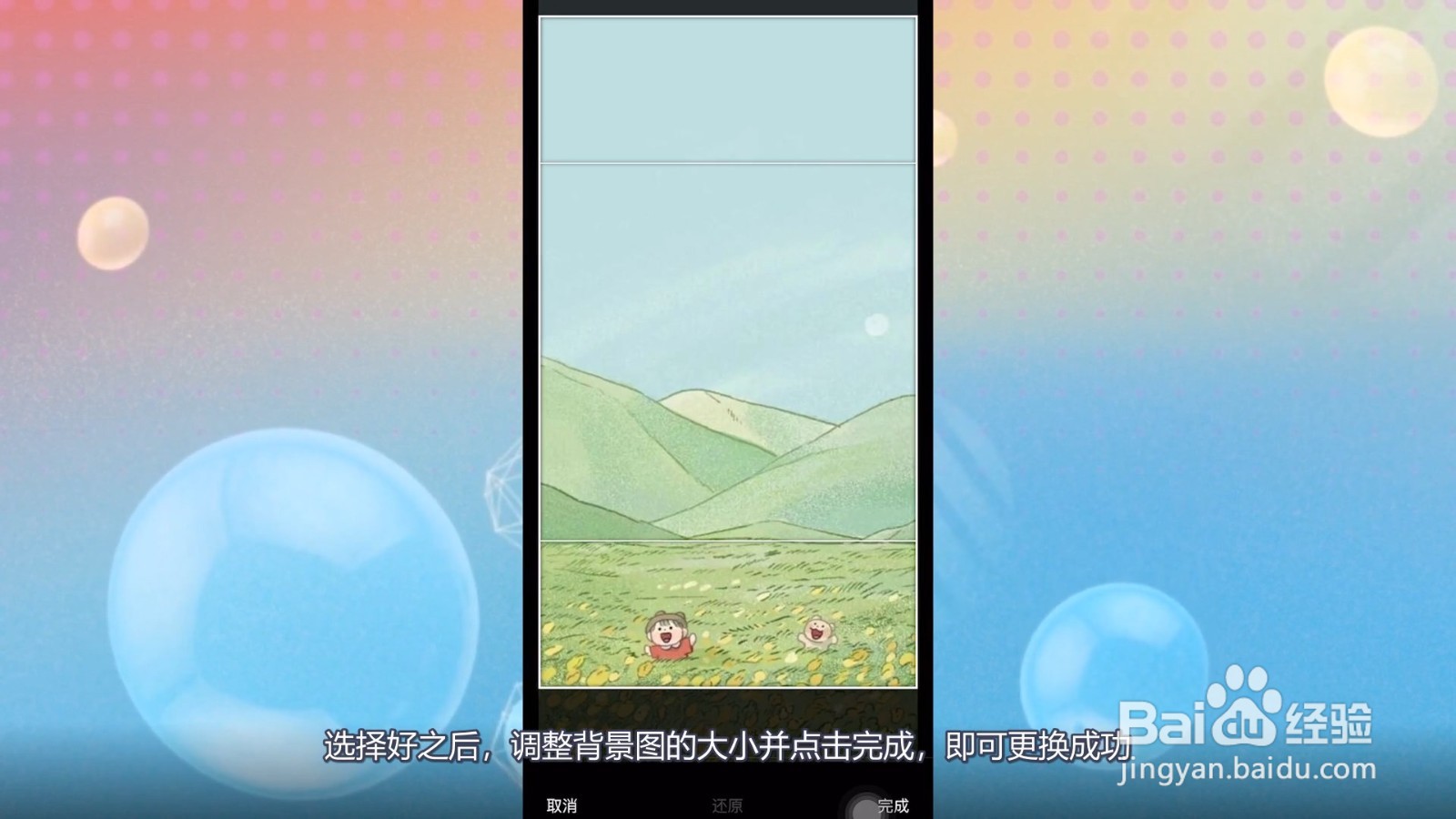 在手机相册中选择一张喜欢的背景图,选择好之后,调整背景图的大小并点击完成,即可更换成功。