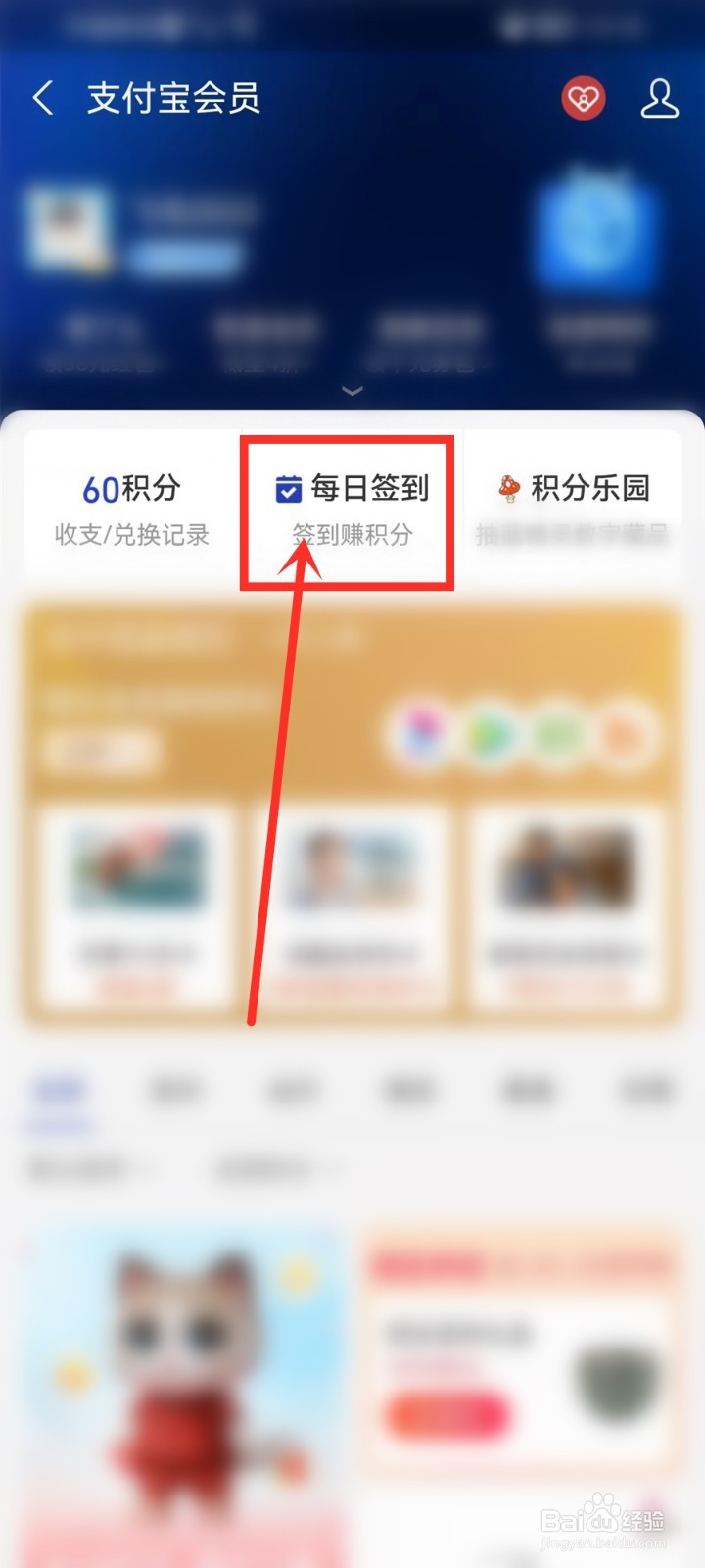 3、进入支付宝会员首页,点击页面上方【每日签到】。