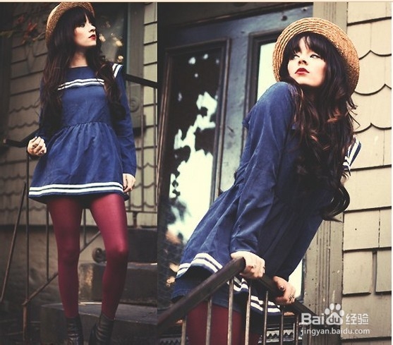 深蓝色海军服连衣裙,酒红色紧身裤,编织的宽檐帽十分有英伦学院风。