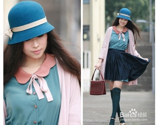 示范搭配:荷叶领雪纺连衣裙+靛蓝色半身裙+粉色长款针织开衫+皮革手提包+蓝色蝴蝶饰小礼帽