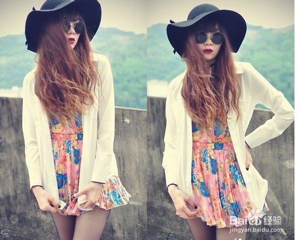 印花连衣裙,外搭薄开衫衬衫,圆形墨镜与宽檐帽搭配,甜美中带有复古感。