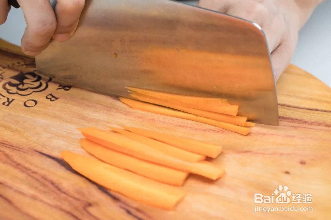 4、100g胡萝卜切成0.2cm的薄片。再改刀切成丝状。