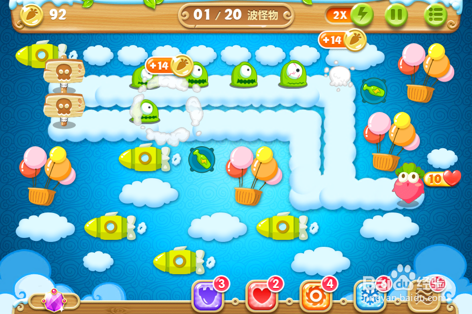 4、一边升级船锚,一边攻击怪物,同时在下面的出口处放一个冰锥给怪物减速,