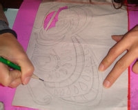初学的同学可以采用绘样摹剪的方法。绘样有两种方法,一种是单线描绘,就是只画图形的外轮廓;另一种是完全按照剪纸的模样双勾描绘。两种绘样摹剪的顺序,应是先双勾描绘,后单线描绘。