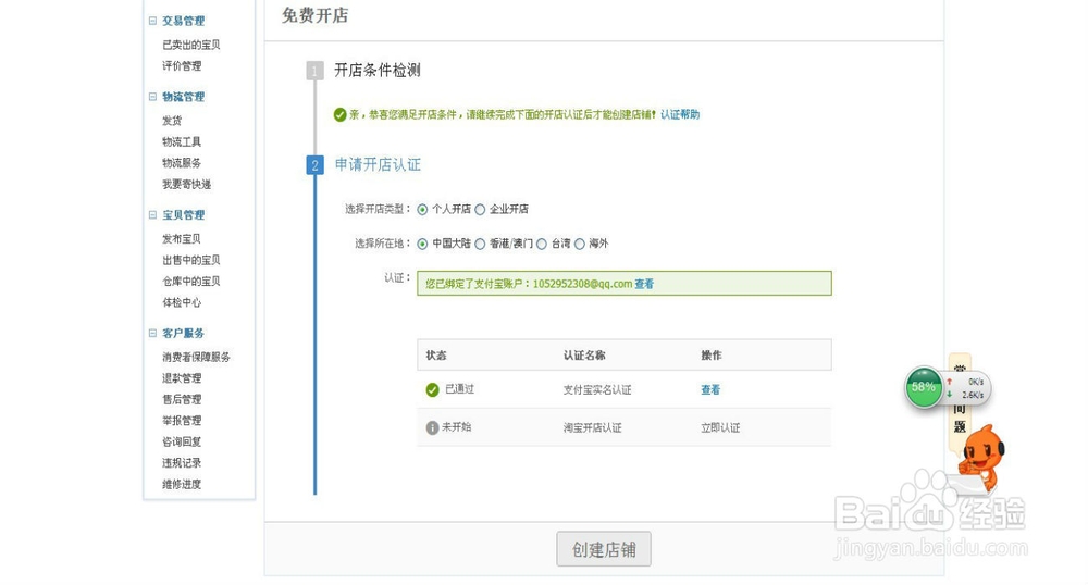 5、完成支付宝实名认证 和淘宝开店认证,然后点创建店铺就可以了